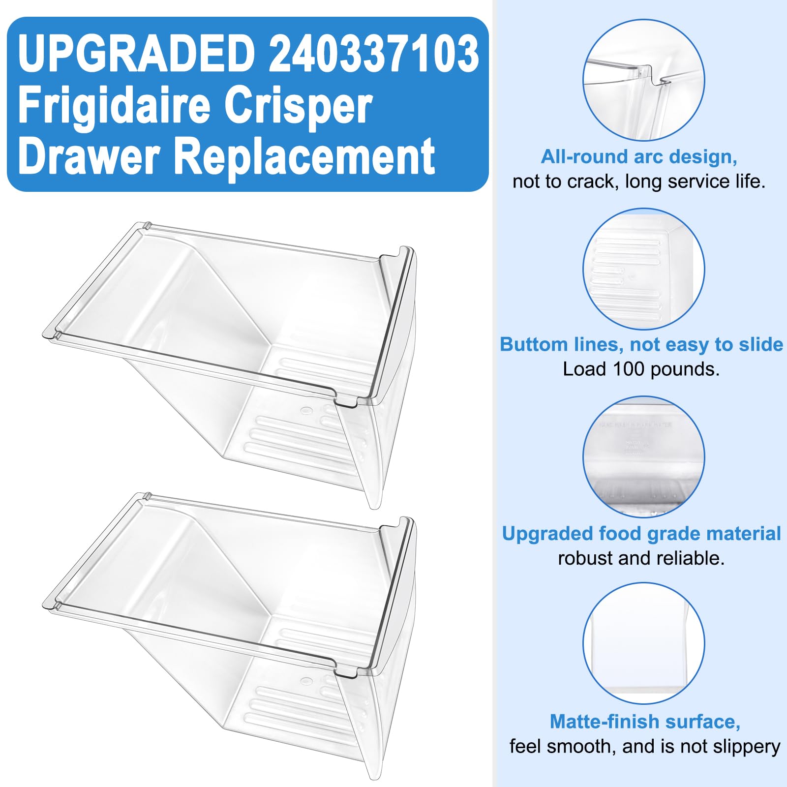 - ăUPGRADED Premium Material 240337103 Crisper Draweră240337103 frigidaire drawer replacement are made of environmentally friendly premium ABS materials(FOOD GRADE) which is durability, pollution-free, safe, and exact fit. Our frigidaire crisper drawer replacement /kenmore crisper drawer meet OEM standard, each of them has been strictly tested.