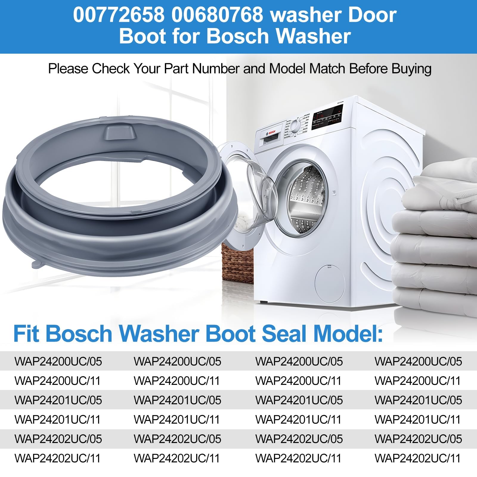 - ăWasher Door Gasket Fits Bosch Washer ModelsăWasher door boot 00772658 00680768 Washing Machines rubber door gasket can Compatible with Bosch washer boot seal fit: WAP24200UC/05, WAP24200UC/11, WAP24201UC/05, WAP24201UC/11, WAP24202UC/05, WAP24202UC/11, WAP24202UC/14, WAS20160UC/16, WAS20160UC/18, WAS20160UC/20, WAS20160UC/23, WAS20160UC/28, WAS20160UC/33, WAS20160UC/38, WAS24460UC/16, WAS24460UC/18, WAS24460UC/20, WAS24460UC/23, WAS24460UC/28, WAT28400UC/01, WAT28400UC/09, WAT28400UC/12, WAT28400UC/24, WAT28400UC/06, WAT28400UC/17,WAT28400UC/14