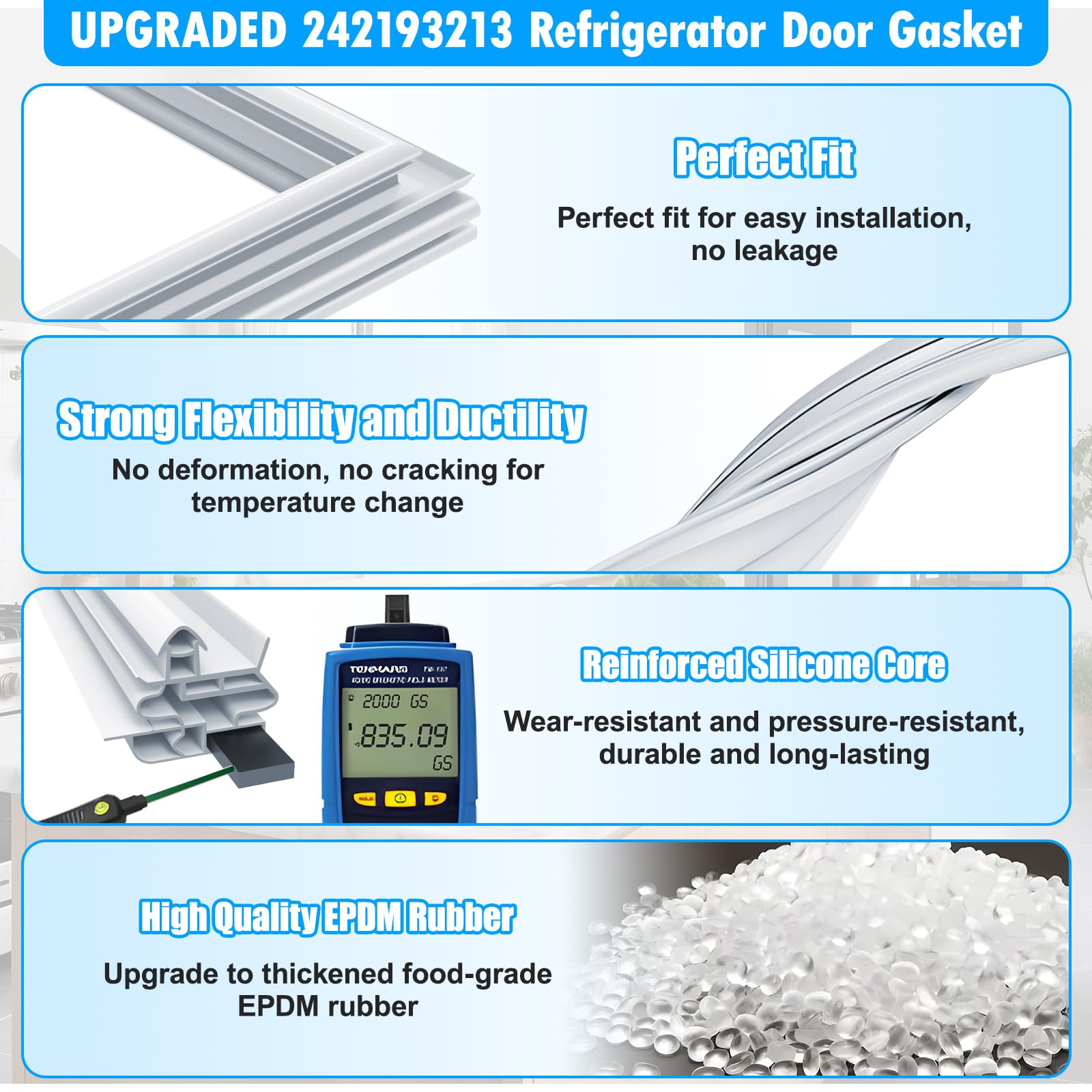 - ăUPGRADED Durable Materials - Embedded Magnetic StripăThe 242193213 refrigerator door gasket is crafted with flexible PVC outer layer and embedded magnetic strip, ensuring optimal insulation by creating a tight seal around the door, preventing 98% cold air leakage. Say goodbye to frost buildup and 20% higher energy bills from inefficient seals! Featuring Cold resistence, high elasticity and flexibility, this Refrigerator Door Gasket for Frigidaire Door Gasket 242193213 can quickly return to its original state after deformation.