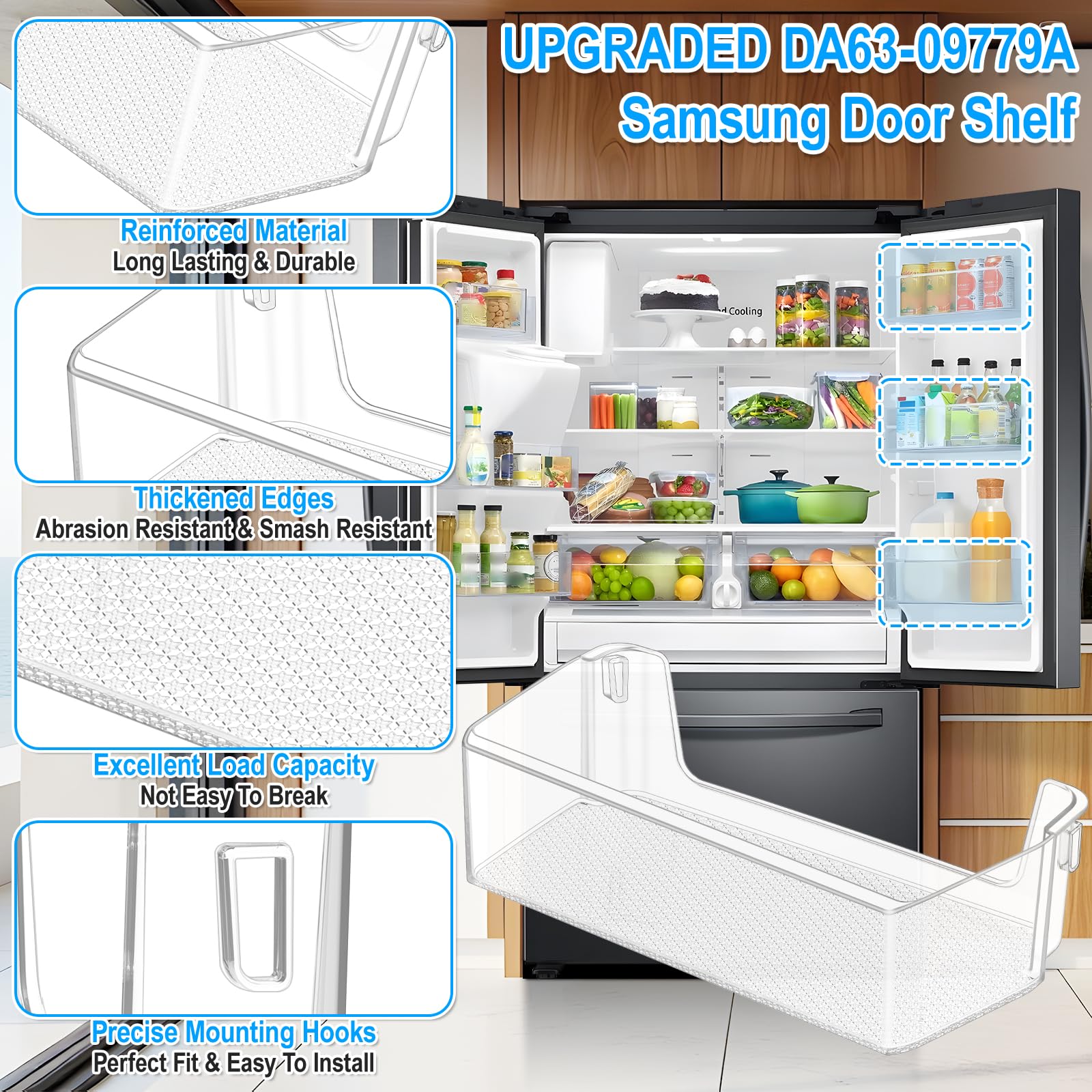 - ăUPGRADED Thickened Food Grade MaterialăUpgraded design of DA63-09779A samsung fridge right door shelves made of high quality thickened food grade materials, durable, strong, environmentally friendly, non-polluting and safe. The material is upgraded and thickened, the specification exceeds OEM.It is stronger than the original product, with good load bearing capacity, not easy to wear or break. Easy to install, save your time and money.