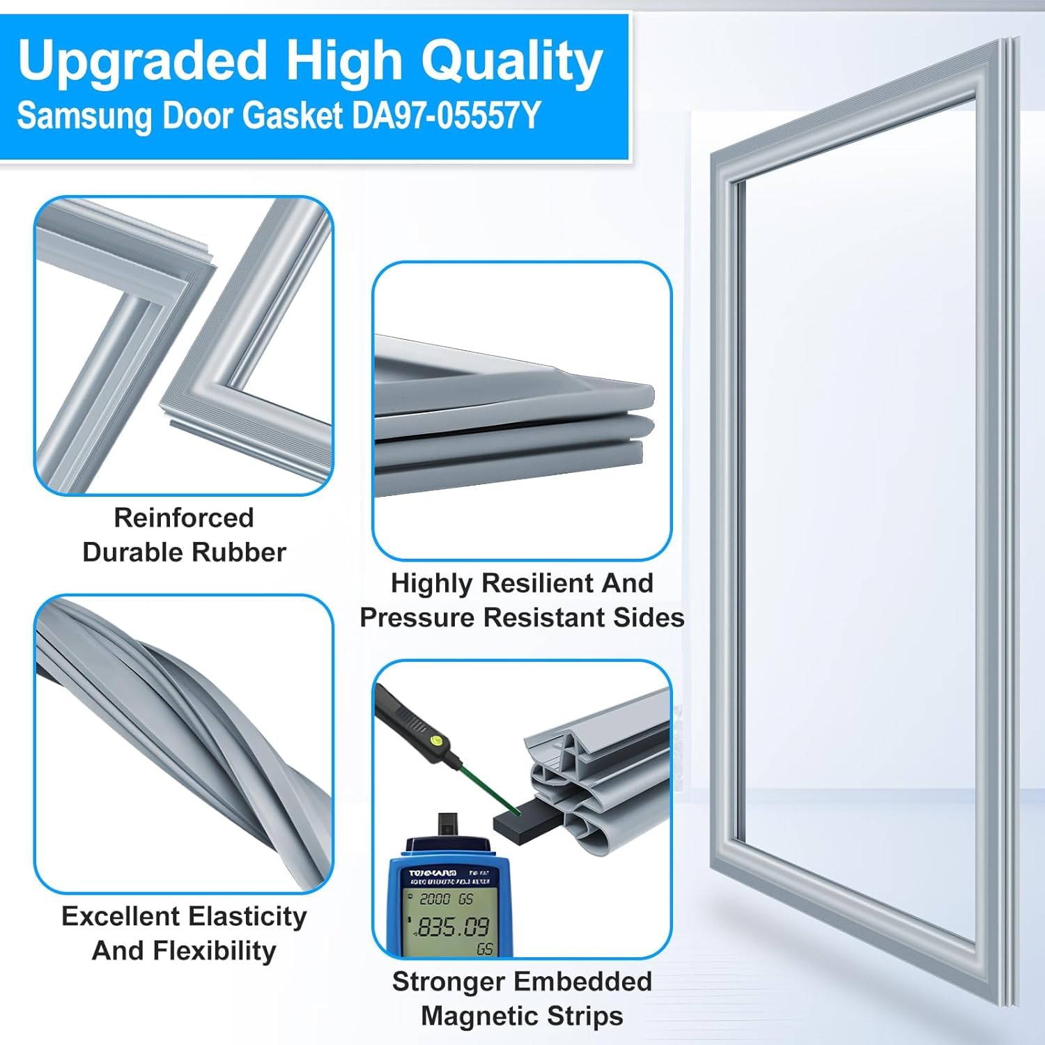 - ăReinforced Durable Rubber DA97-05557Y Freezer Door GasketăCrafted with flexible PVC outer layer and embedded magnetic strip, this Samsung Door Gasket DA97-05557Y freezer door seal functions as a crucial seal around the refrigerator door frame. Featuring Cold resistence, high elasticity and flexibility, this Samsung refrigerator seal DA97-05557Y freezer seal replacement can quickly return to its original state after deformation. A well-functioning samsung refrigerator door seal ensures your refrigerator cycles less frequently, reducing unnecessary wear on the appliance and improving overall efficiency.