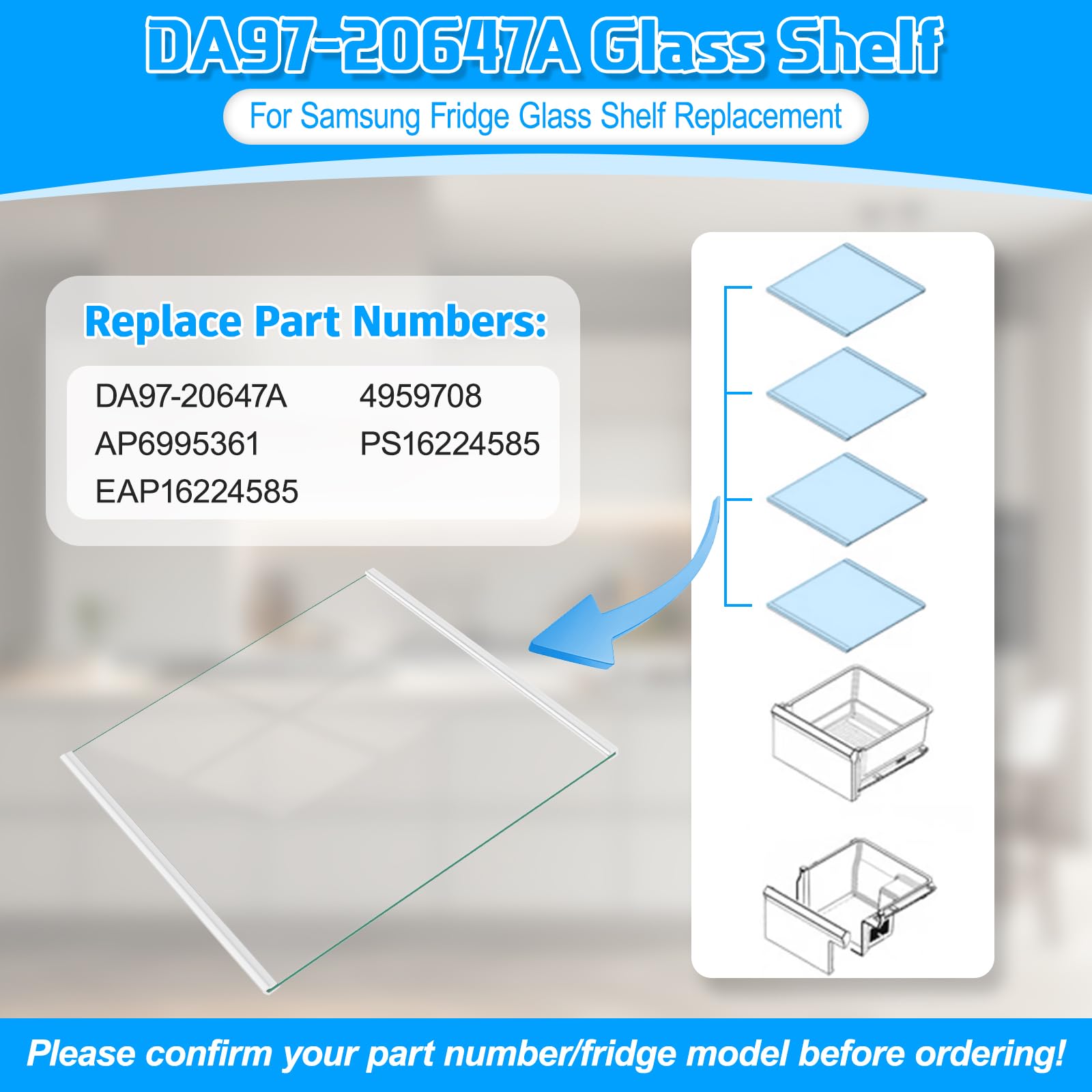 - ăDA97-20647A Refrigerator Shelf Assembly - Part NumberăThis Samsung DA97-20647A shelf glass for samsung refrigerator door shelf replacement glass shelf replace part numbers: DA97-20647A, AP6995361, PS16224585. da97-20647a Samsung refrigerator glass shelf with accurate dimensions(17.7"x 18.3"). DA97-20647A samsung fridge glass shelf only fit for Samsung refrigerator parts right side -Upper samsung glass shelf replacement.