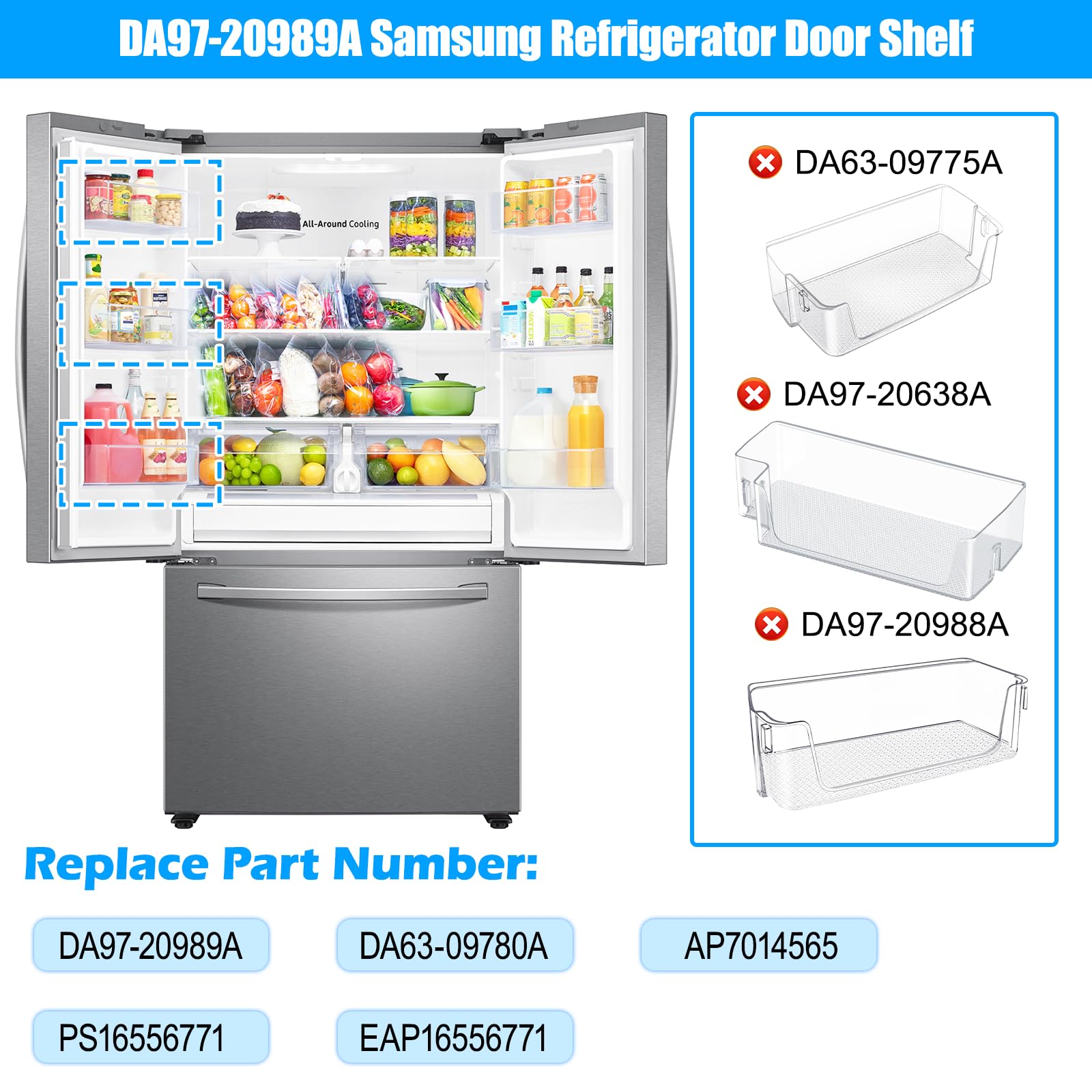 - ăDA97-20989A Samsung Refrigerator Door Shelf Replacement-Easy InstallationăDA97-20989A Door shelf bin for Samsung replacement door shelf designed for seamless installation, have undergone multiple rigorous tests to accurately measure its size, ensuring align perfectly with the refrigerator's slot, fits perfectly and works great.