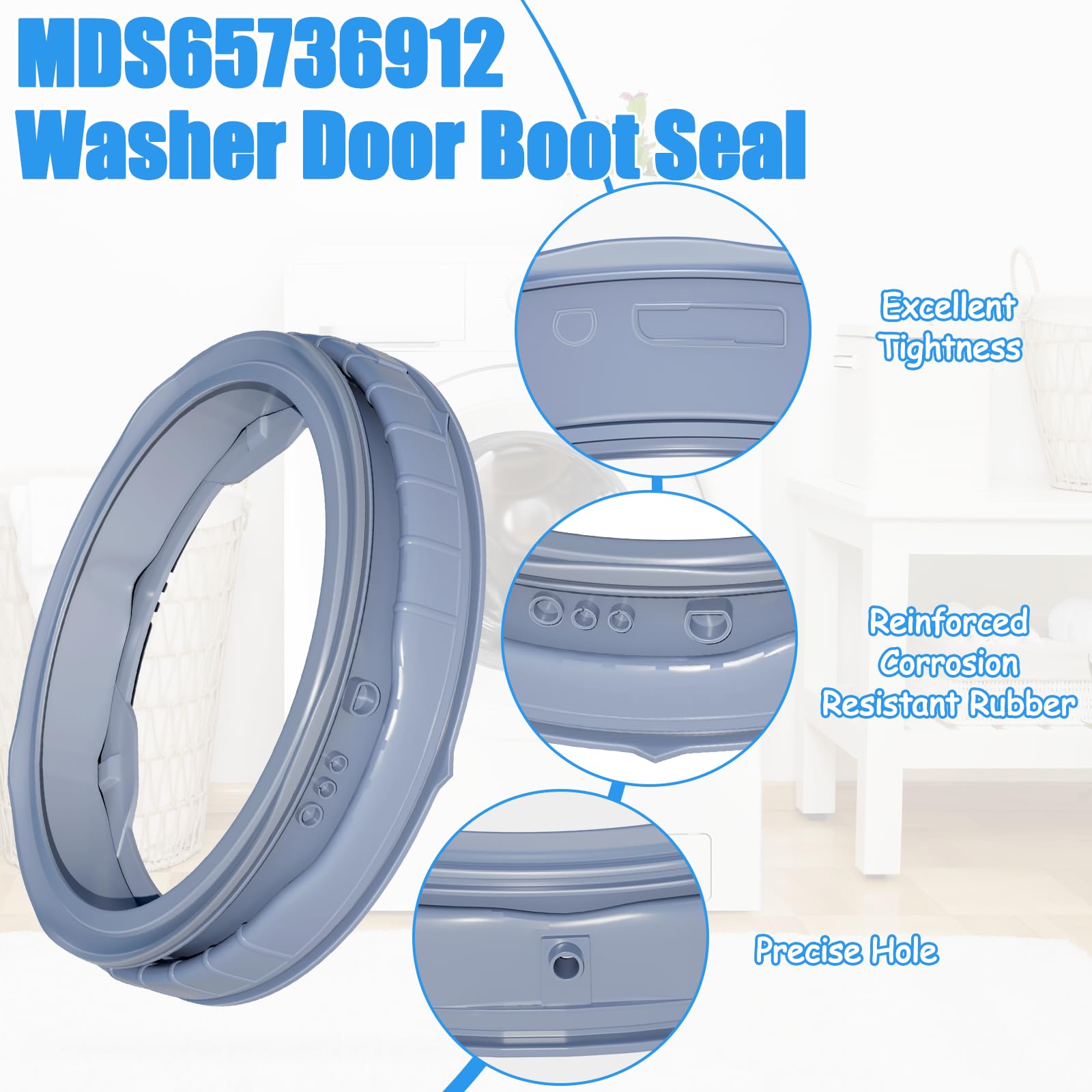 - ăExcellent Sealing PerformancelăMDS65736912 lg washer door boot seal Gasket Helps prevent water leakage & detergent from leaking from the door and maintain energy efficiency by creating a tight seal around the washer door. Upgraded MDS65736912 lg front load washer door seal fixes the following symptoms: A: Splashes water during operation; B: Cannot be sealed; C: Door seal has Broken; D: Odors cannot be eliminated; E: Abnormal noise.