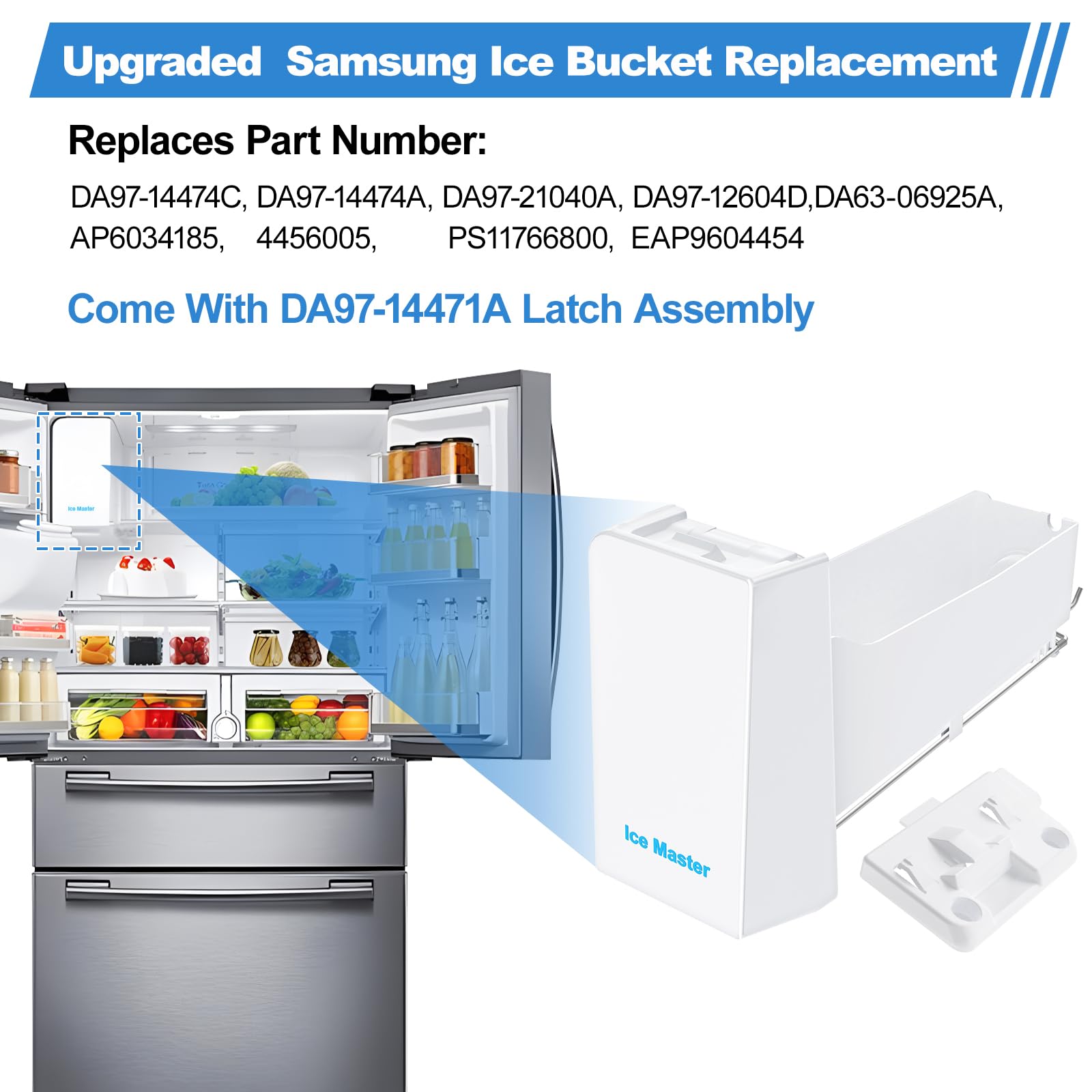 - ăRefrigerator ice Maker ReplacementăAdditional Part Mounting Plate-Latch Assembly, Refrigerator ice bucket replacement DA97-14474C/DA97-14474A samsung icemaker was easy to install. Just slides right in to ice maker inside refrigerator.Package: 1 X DA97-14474C samsung ice bucket, 1 X Refrigerator Latch Plate.365 Days warranty. Please contact us at any time if the there is any problem in the product, damaged or not fit. We provide full after-sales service and will try our best to solve the problem