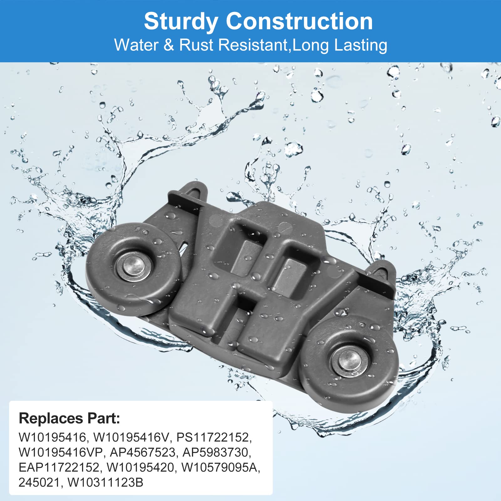 - ãW10195416/W10195416V Dishwasher Rack Wheels Replace & CompatiblityãThis W10195416v dishwasher rack wheels Replaces Part W10195416,W10195416V, PS11722152, W10195416VP, 4245021, AP4567523, EAP11722152, AP5983730, W10195420, W10579095A,W10311123B. Dishwasher rack replacement for most top name brand (KitchenAid, Maytag, Kenmore, Whirlpool, Amana) dishwasher parts.Fit KDFE104DSS5, wdt750sahz0, wdta50sahz0, wdt970sahz0, KUDE40FXSS5, WDF590SAJW0, KDTE334GPS0, kuds35fxss9, kude60fxss4 etc dishwasher replacement wheels