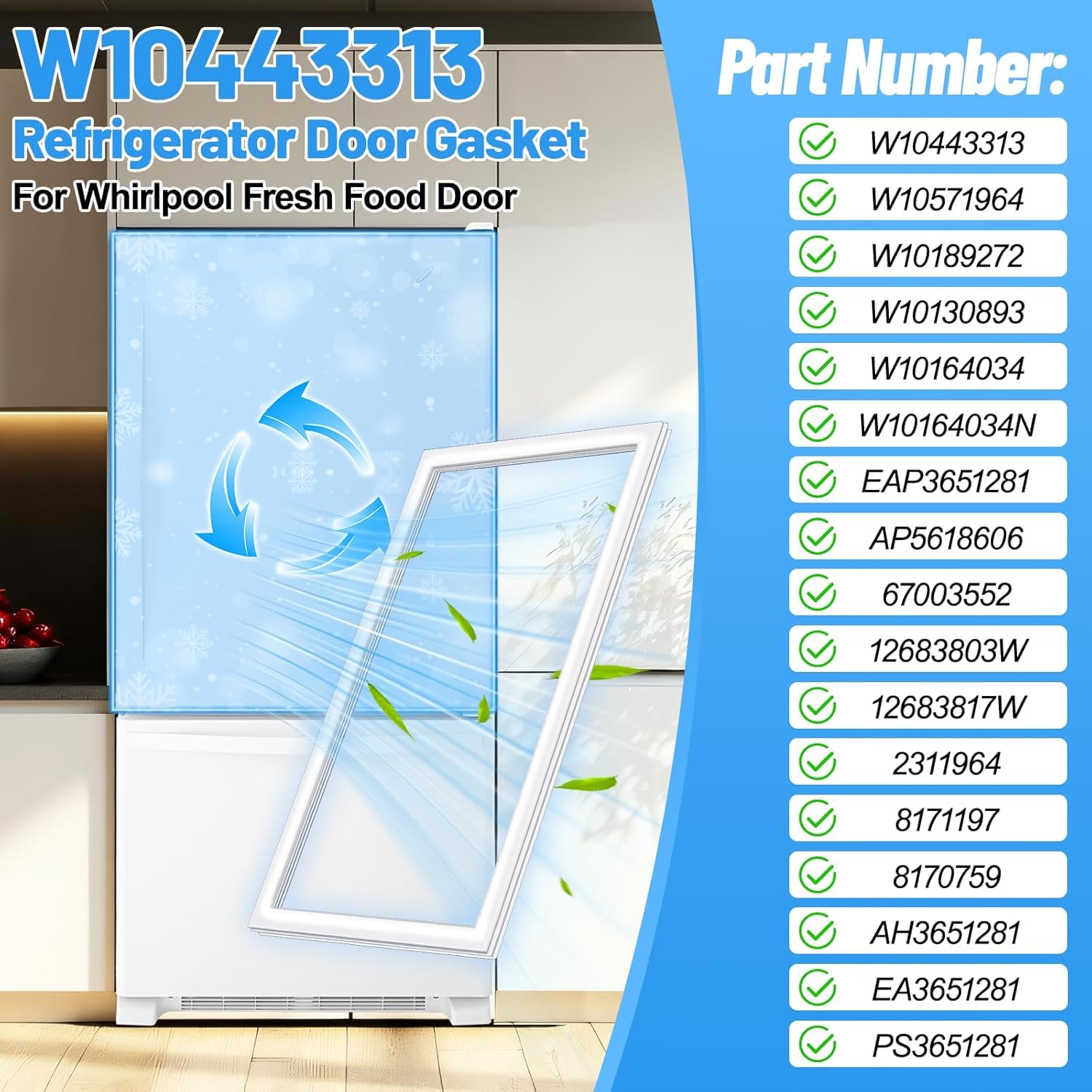 - ăPart Numbers For Whirlpool Door Gasket W10443313ăThis W10443319 Refrigerator Door Gasket For Kenmore freezer door gasket with precise dimensions(31.1" x 39.57"), replace part numbers: W10443313, W10571964, W10189272, W10130893, W10164034, W10164034N, EAP3651281, AP5618606, 67003552, 12683803W, 12683817W, 2311964, 8171197, 8170759, AH3651281, EA3651281, PS3651281. This Whirlpool W10443313 Door Gasket, White is suitable for Whirlpool/Kenmore upright door gasket seal, providing an effective seal around the door to prevent warm air from entering the Whirlpool Kenmore refrigerator parts.