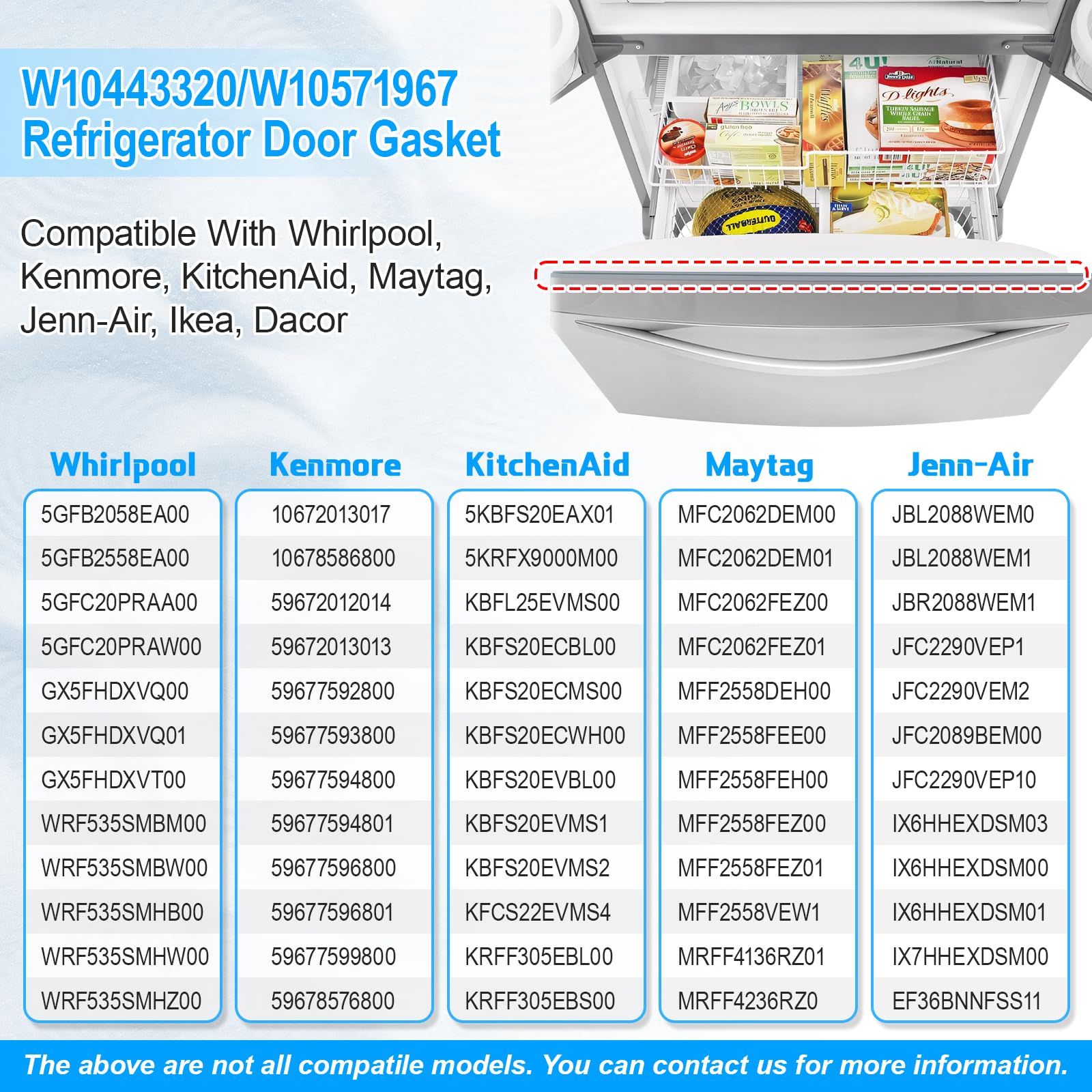 - ăFreezer Seal Replacement-Compatible ModelsăThe W10571967 freezer door seal Compatible with Whirlpool KitchenAid Maytag Jenn-Air Ikea Dacor Kenmore refrigerator freezer door gasket seal part. Fit Models: WRF535SMBB00, WRF535SMBM00, WRF535SMBW00, WRF535SMHB00, WRF535SMHW00, WRF535SMHZ00, WRF535SMHZ01, WRF535SMHZ02, WRF535SMHZ03, WRF535SMHZ04, WRF535SMHZ06, WRF535SMHZ08, WRF535SWBB00, WRF535SWBM00, WRF535SWBW00, WRF535SWHB00, WRF535SWHB10, WRF535SWHV00, WRF535SWHV02, WRF535SWHV10, WRF535SWHW00, WRF535SWHZ00, WRF535SWHZ01, WRF535SWHZ02, WRF535SWHZ03, GX5FHDXVA01, GX5FHDXVQ01, MFF2558FEZ01, MFF2558VEM4, MFF2558VEM6, KFCS22EVBL00, KFCS22EVBL1, KFCS22EVMS1, KFCS22EVMS3, KFCS22EVWH00 etc.