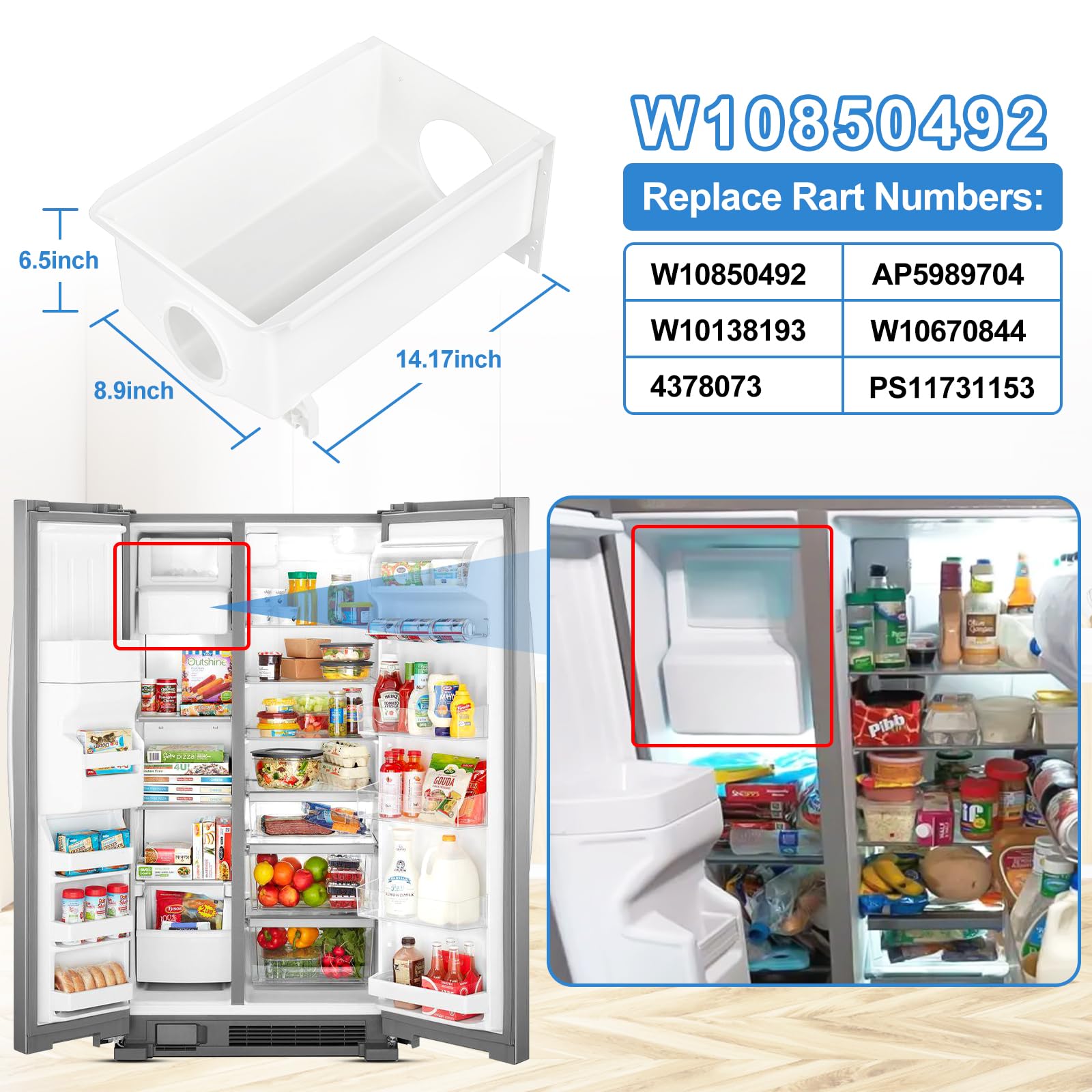 - ăW10850492 Ice Bucket for whirlpool RefrigeratorăUpgraded refrigerator ice container W10850492 ice bucket for Whirlpool ice maker replacement parts. Replaces Part Number is W10850492, AP5989704, W10138193, W10670844, 4378073, PS11731153. W10850492 whirlpool ice bucket fixes symptoms: A:Leaking ice bucket ; B: ice buckets are cracks; C: Ice not dispensing properly.