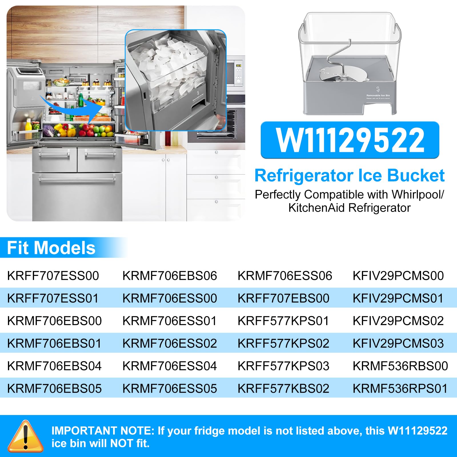 - ăW11129522 kitchenaid Ice Bin ReplacementăW11129522 W10564750 refrigerator ice container Compatible with Whirlpool, KitchenAid refrigerator parts,fit whirlpool kitchenaid removable ice bin W11129522 models: KRMF706ESS04, KRMF706ESS05, KRMF706ESS06, KRMF706EBS06, KFIV29PCMS03, KRFF707ESS01, KRMF706EBS01, KRMF706ESS01, KFIV29PCMS00, KFIV29PCMS01, KFIV29PCMS02, KRFF707EBS00, KRFF707ESS00, KRMF706EBS00, KRMF706EBS04, KRMF706EBS05, KRMF706ESS00, KRMF706ESS02, KRMF536RBS00, KRMF536RPS01, KRFF577KBS02, KRFF577KPS01, KRFF577KPS02, KRFF577KPS03 etc