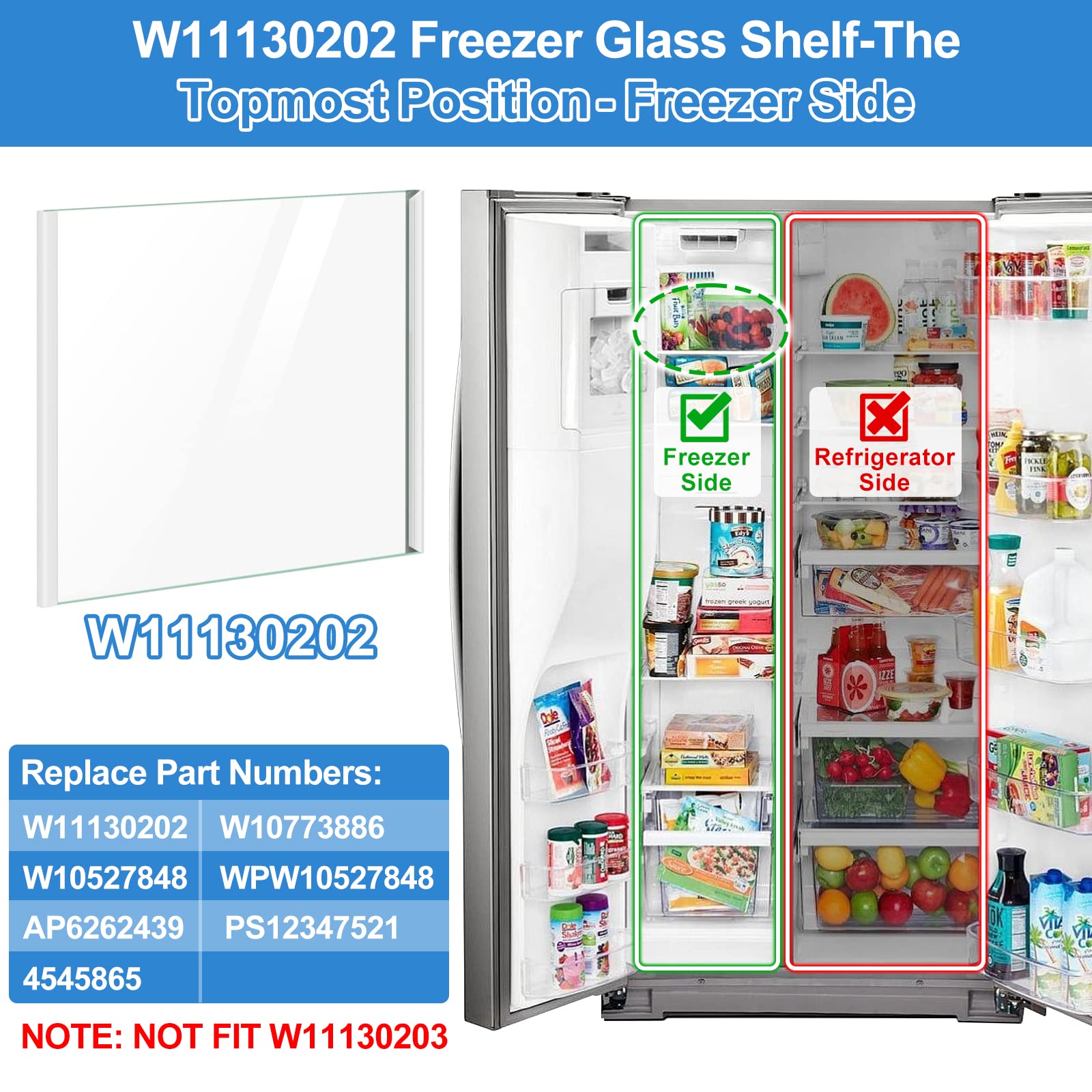 - ăW11130202 Whirlpool Freezer Shelf - Part NumberăThis W11130202 whirlpool fridge glass shelf replaces Parts Number: W11130202, W10773886, W10527848, WPW10527848, AP6262439, PS12347521, 4545865.NOT FIT W11130203.Whirlpool shelf replacement fits the freezer-side of the listed Whirlpool refrigerator/freezer appliances ONLY. If you are not sure whether the W11130202 freezer shelf replacement fits your whirlpool freezer shelf, please feel free to contact us,we can confirm it for you.