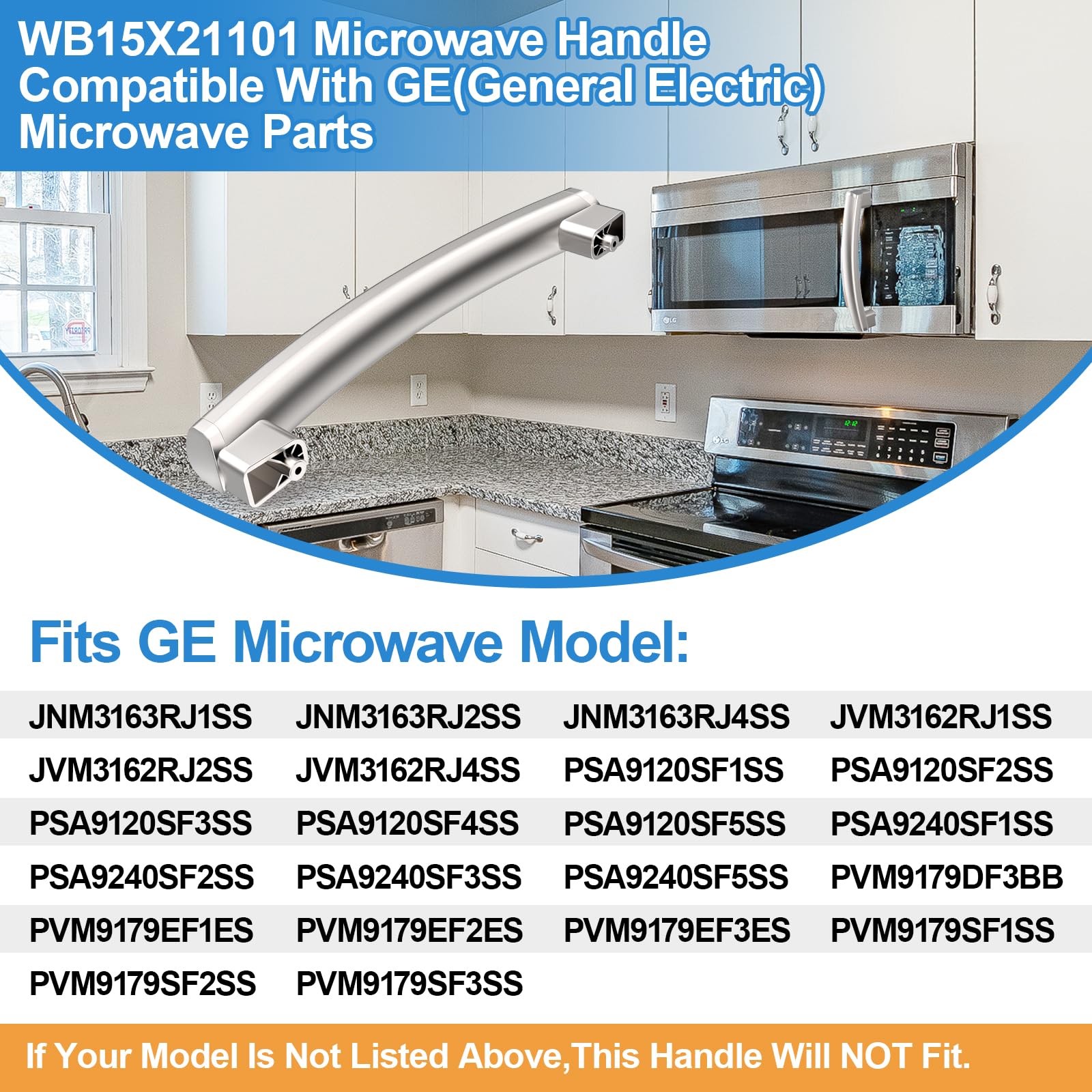 - ăWB15X21101 Microwave Handle PartsăMicrowave door handle wb15x21101 Compatible with GE(General Electric)Microwave replacement door handle.Fits GE microwave door model:JNM3163RJ1SS, JNM3163RJ2SS, JNM3163RJ3SS, JNM3163RJ4SS, JVM3162RJ1SS, JVM3162RJ2SS, JVM3162RJ3SS, JVM3162RJ4SS, PSA9120SF1SS, PSA9120SF2SS, PSA9120SF3SS, PSA9120SF4SS, PSA9120SF5SS, PSA9240SF1SS, PSA9240SF2SS, PSA9240SF3SS, PSA9240SF5SS, PVM9179DF3BB, PVM9179EF1ES, PVM9179EF2ES, PVM9179EF3ES, PVM9179SF1SS, PVM9179SF2SS,PVM9179SF3SS