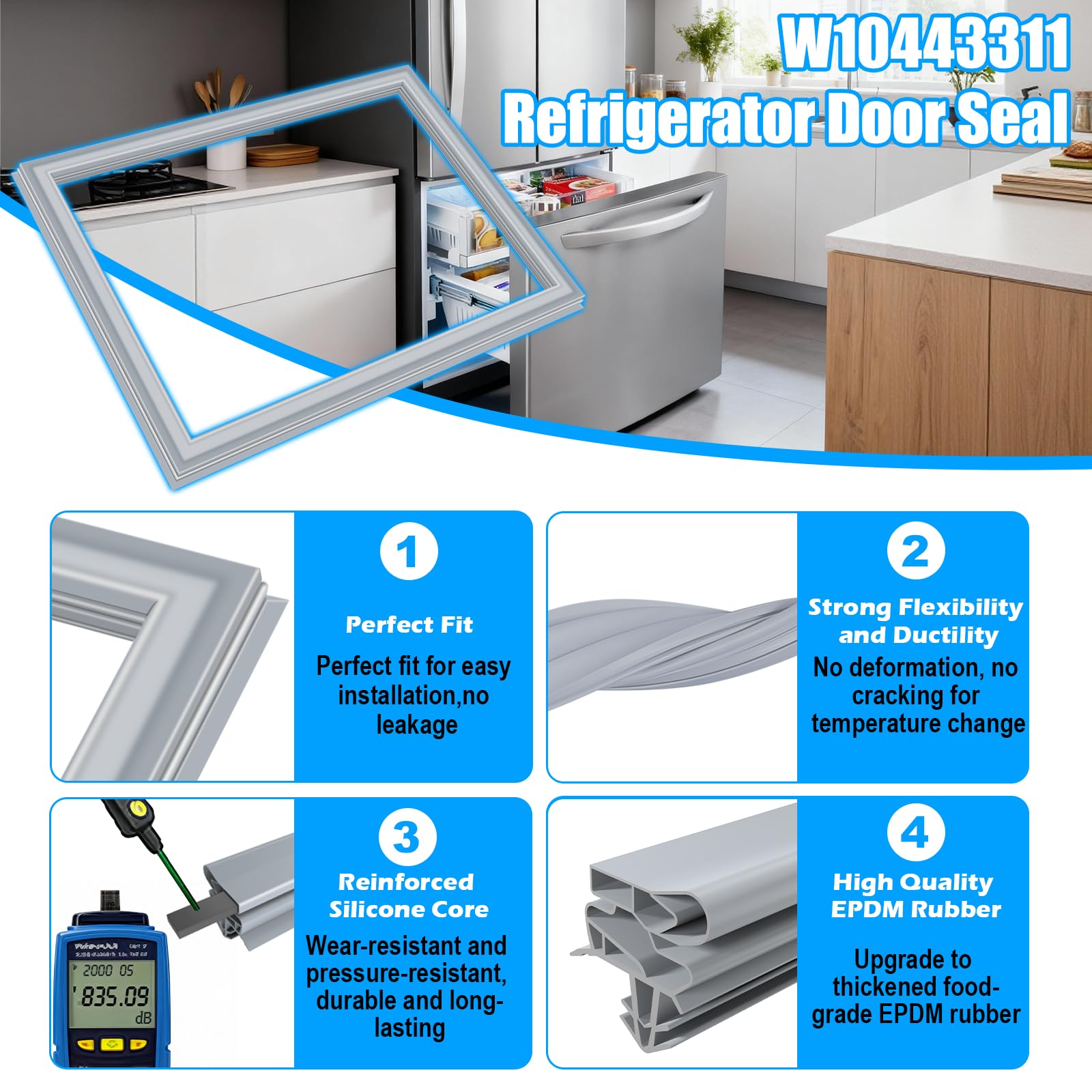 - ăUpgraded WPW10443311 Freezer Door GasketăWPW10443311 W10443311 refrigerator door seal is crafted with flexible PVC outer layer and embedded magnetic strip, this WPW10443311 Whirlpool refrigerator door gasket is built to an optimal insulation by creating a tight seal around the door, preventing 98% cold air leakage. Featuring Cold resistence, high elasticity and flexibility, this WPW10443311 refrigerator door gasket seal for Whirlpool refrigerator door seal replacement can quickly return to its original state after deformation.