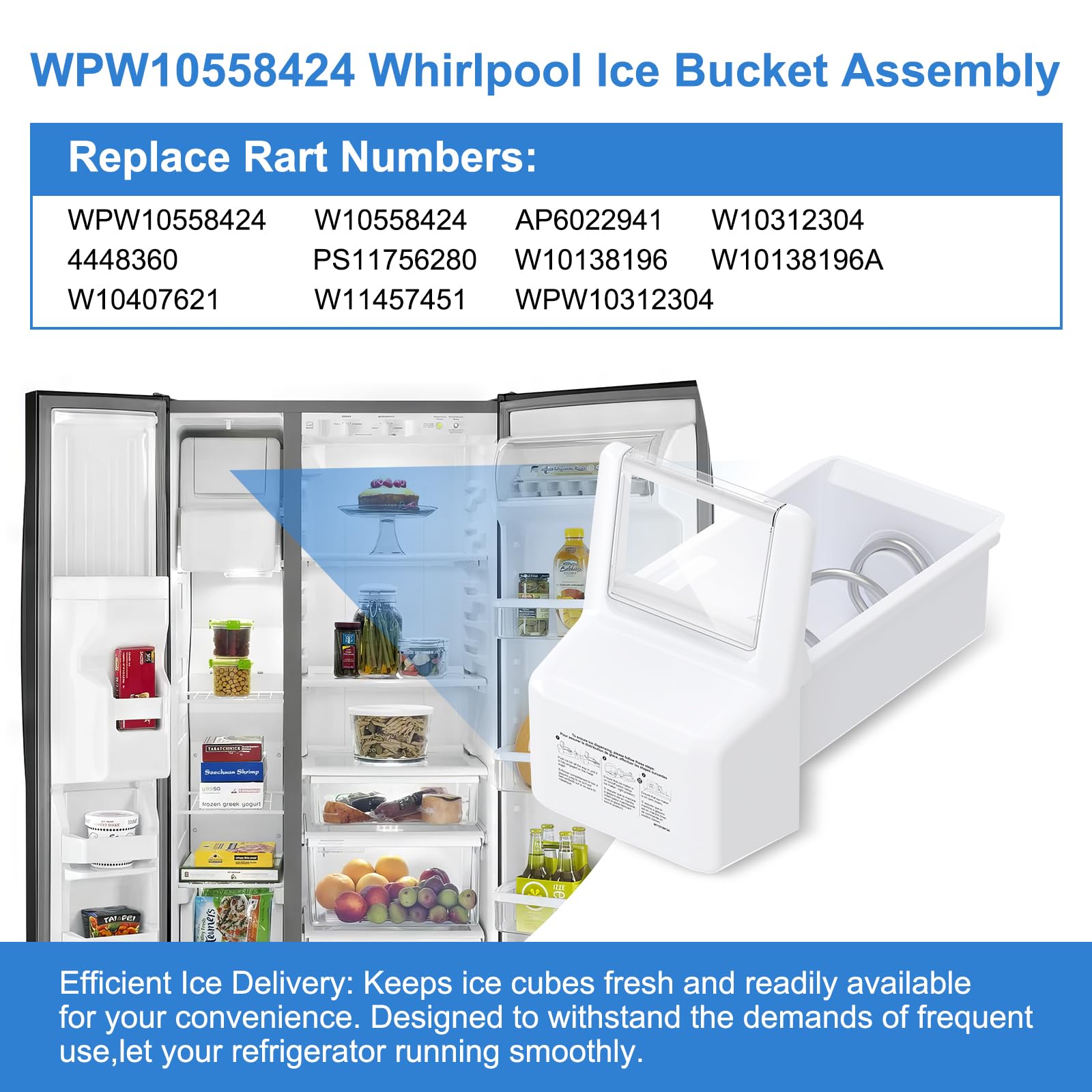 - ăUpgraded WPW10558424 Ice Bucket for Whirlpool Ice MakerăUpgraded Whirlpool w10558424 ice Container wpw10558424 whirlpool ice bucket replacement with auger for whirlpool ice maker replacement. Replaces Part Number is WPW10558424, W10558424, AP6022941, W10312304, 4448360, PS11756280, W10138196, W10138196A, W10407621, W11457451, WPW10312304. whirlpool ice maker tray parts wpw10558424 Dispenser Chute easy to dispense cubed / crushed ice.Thickened blades,dispense cubed and crush Ice Is well. Sturdier and stronger than original.