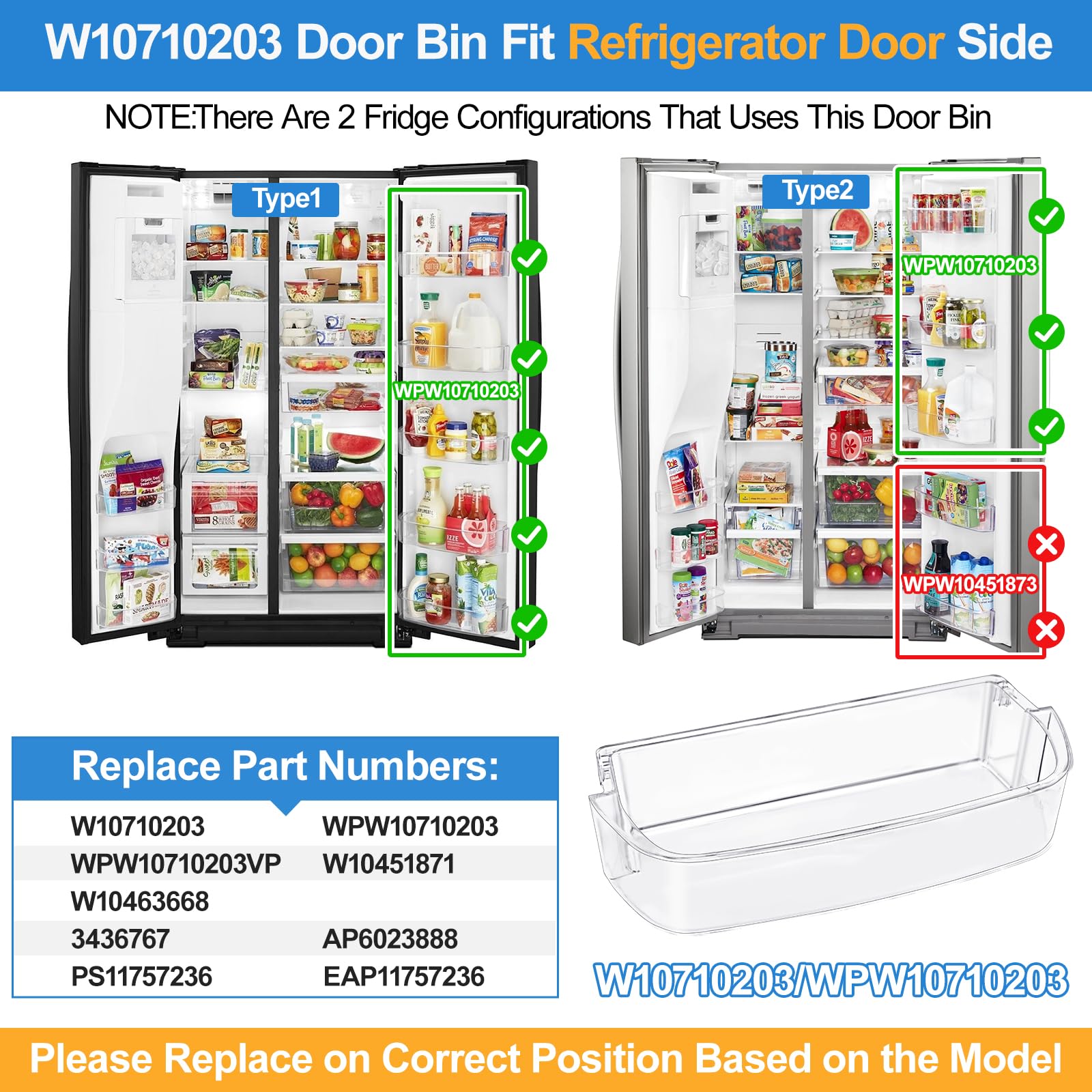 - 【WPW10710203 Whirlpool Shelf Replacement-Part Number】WPW10710203 Whirlpool fridge door shelf replacement replace part number: WPW10710203, W10710203, WPW10710203VP, W10451871, W10463668, 3436767 AP6023888, PS11757236, EAP11757236. This WPW10710203 kenmore fridge shelves for the fridge RIGHT side door parts only with Highest performance and superior quality.